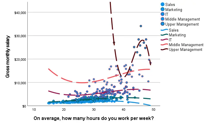 无论如何,请注意,R 平方 (R-square) -回归的常见 效应量度量 (effect size measure)- 对于除高层管理人员之外的所有组来说都介于良好和优秀之间。 如果我们忽略子组的存在,这少数案例可能是我们看到的曲线关系的主要原因。