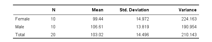 接下来,他分别计算男性和女性受访者每月通话分钟数的均值和标准差。结果如下所示。