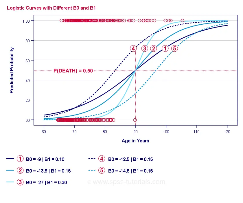 可以看到这一点。请注意,这些曲线的 \(b_0\) 不同,但 \(b_1\) 相等。 - 随着 \(b_0\) 的增加,预测概率也会增加:给定年龄 = 90 岁,曲线