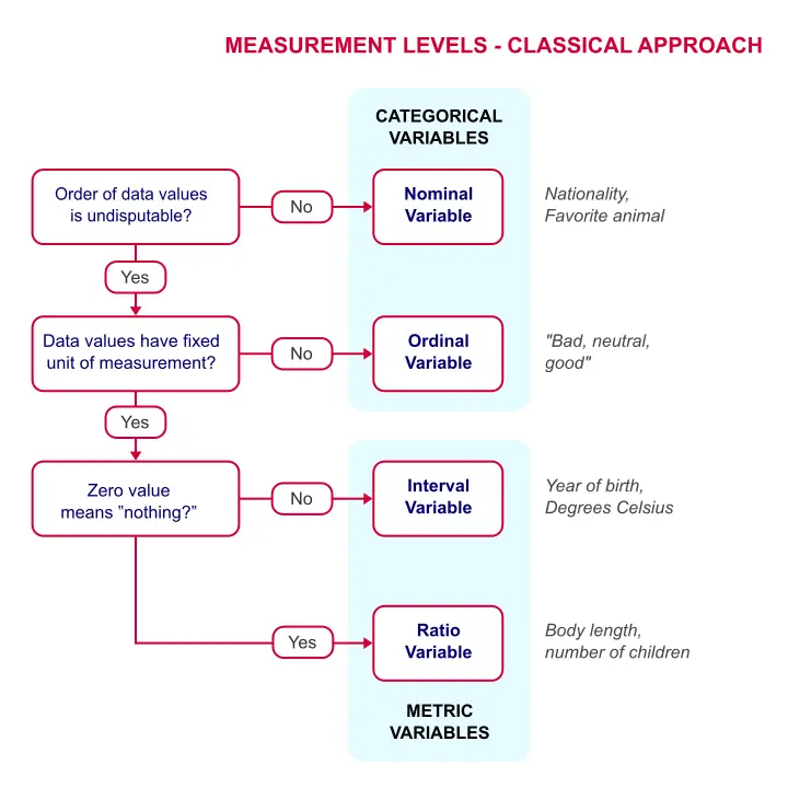 测量尺度越高,变量包含的信息就越多。下面的简单流程图展示了如何对变量进行分类。