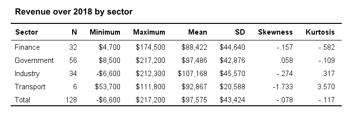 或者,也许我们想知道分类变量和度量变量是否相关联。 分类变量定义组。 在这些组中,我们将检查度量变量的描述性统计信息。 因此,我们得到了如下表所示的表格。