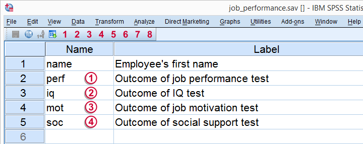 为了使用回归分析,我们需要模型中四个变量(1 个因变量和 3 个自变量)的数据。因此,我们让员工参加一些测试来衡量这些变量。我们收集的部分原始数据如下所示。