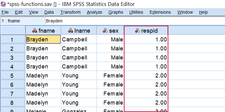如果每个受访者都有相同数量的试验,则 TRUNC 在创建受访者标识符时非常方便,如 compute respid = trunc(($casenum - 1) / 4) + 1. 中所示。 下面显示了在 spss-functions.sav 上运行的结果。