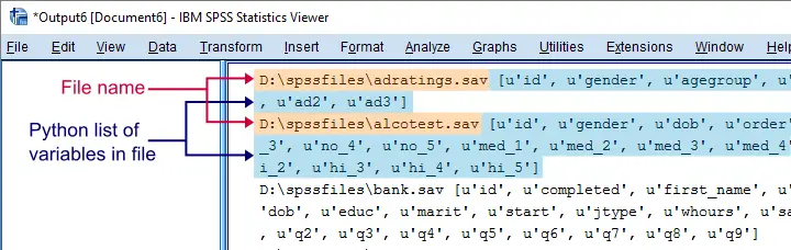 通常,我们使用类似 GET FILE "d:\spssfiles\mydata.sav". 的命令在 SPSS 中打开一个数据文件。如果我们将文件名替换为 Python 列表中的每个路径,我们将逐个打开每个数据文件。然后,我们可以添加一些想要在每个文件上运行的语法。最后,我们可以使用 SAVE OUTFILE "..." 保存我们的编辑,这样就可以批量处理多个文件。然而,在本例中,我们将简单地使用 spssaux.GetVariableNamesList() 查找每个文件包含哪些变量。