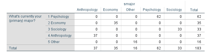 我们得到的不重复专业名称的 Python 列表看起来不错!如果想确保数据的准确性,可以在 SPSS 中运行 FREQUENCIES SMAJOR. 命令,确认 这些确实是数据中的专业。现在我们已经完成了准备工作,接下来我们将创建实际的 SPSS 语法。