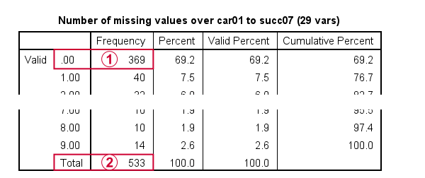 请注意,在 N = 575 个案例中,只有 369 个案例在所有 29 个变量上都有零缺失值。