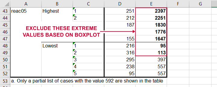 那么,我们应该准确地排除哪些值呢? 我们在“极端值 (Extreme Values)”表中找到它们。 我喜欢将其复制粘贴到 Excel 中。 现在我们可以轻松地将根据我们的箱线图被认为是极端值的所有值加粗。