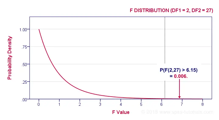 如果满足这些假设 (assumptions),则 F 服从具有 DFbetween 和 DFwithin 自由度的 F 分布。在我们的示例中 - 3 组,每组 n = 10 - 这将是 F(2,27)。