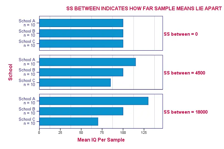 那么,我们的 3 个样本均值究竟有多不同?这些数字相距有多远?一个告诉我们这一点的数字是方差 (variance)。因此,我们基本上会计算 3 个样本均值之间的方差。正如您可能(或可能不会)从 ANOVA 公式 中理解的那样,这首先要计算 3 个样本均值与总体均值之间的平方偏差之和。结果称为“组间平方和 (sums of squares between)”或 SSbetween。因此,组间平方和 (sums of squares between) 表达了样本均值之间的总离散量。在其他条件相同的情况下,较大的 SSbetween 表明样本均值差异更大。而且,我们的样本均值越不同,我们的总体均值也越有可能不同。