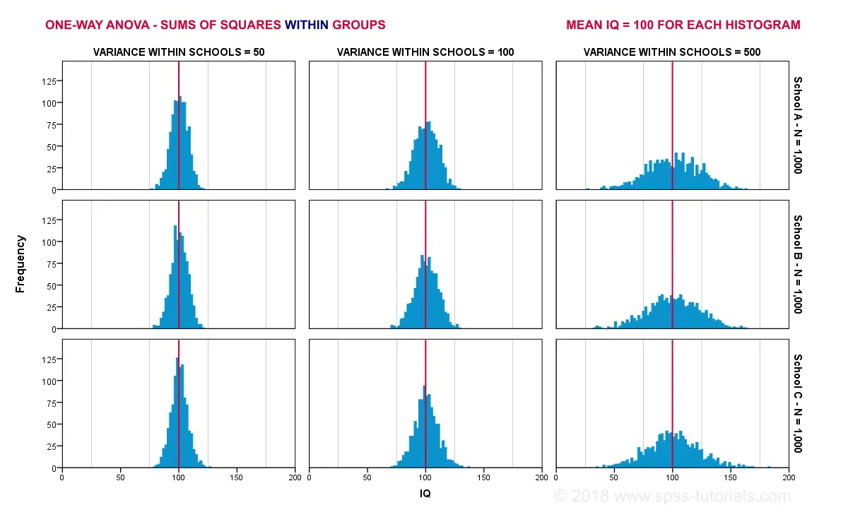 3 个****最左边的直方图显示了学校 A、B 和 C 中智商 (IQ) 的总体分布。它们的窄度表明每个学校 内部的方差 (variance) 都很小。如果我们从每所学校抽取 n = 10 名学生,我们是否应该预期非常不同的样本均值 (sample means) 呢?可能不会。为什么?嗯,由于每个学校内部的方差 (variance) 很小,因此样本均值 (sample means) 将接近于(相等)的总体均值。这些窄直方图没有留下太多空间让它们的样本均值 (sample means) 波动 - 因此 - 差异。