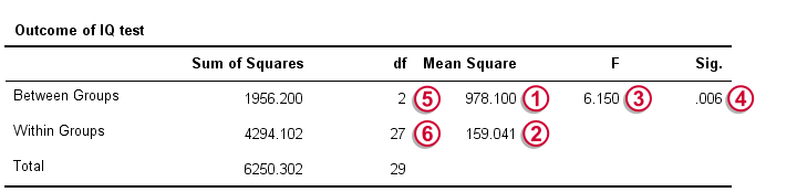 鉴于此分布,我们可以查找 统计显著性 (statistical significance)。我们通常报告:F(2,27) = 6.15,p = 0.006。如果我们的学校具有相等的平均智商,那么找到我们的样本均值差异或更大的差异的可能性只有 0.006。如果 p < 0.05,我们通常说某事“具有统计显著性 (statistically significant)”。结论:我们的总体均值 不太可能 相等。下图显示了 SPSS 如何呈现此示例的输出。