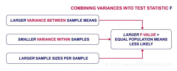 我们基本上将所有这些信息组合成一个数字:我们的 检验统计量 F (test statistic F)。下图显示了每条证据如何影响 F。
