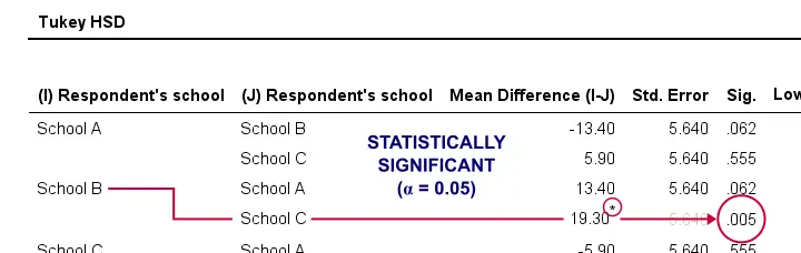 解决此问题的最常见方法是使用 Tukey’s HSD(“Honestly Significant Difference”的缩写)程序。您可以将其视为运行所有可能的 t 检验,其结果已使用某种 Bonferroni 校正 进行了校正,但保守程度较低。下图显示了 SPSS 中 Tukey’s HSD 的一些输出。