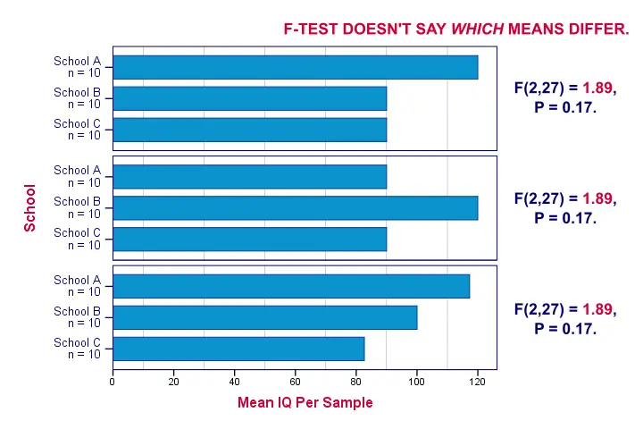 到目前为止,我们从 F 检验得出结论,我们的总体均值 (全部) 相等的可能性很小。效应量 (effect size) η2 告诉我们差异很大。但是,一个未解决的问题是究竟 哪些 均值不同?不同的样本均值模式都可能导致完全相同的 F 值。下图用一些可能的场景说明了这一点。