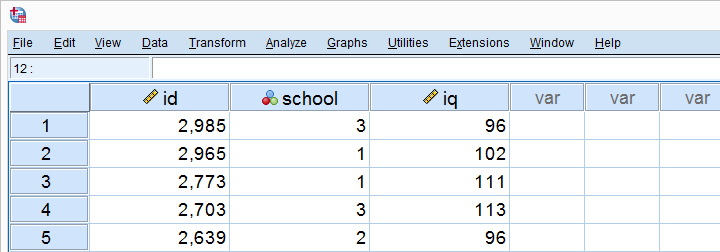 一位科学家想知道来自学校 A、B 和 C 的所有孩子的平均智商分数是否相等。每所学校有 1,000 名儿童。测试所有 3,000 名儿童需要花费太多的时间和金钱。因此,对每所学校的 n = 10 名儿童进行了简单的随机抽样测试。部分数据 - 可从 此 Google 表格 获得 - 如下所示。