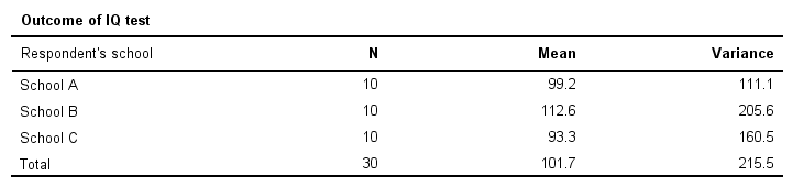 好的,我们的数据包含 3 个样本,每个样本有 10 个孩子及其智商分数。运行一个简单的描述性统计表 (descriptives table) 立即告诉我们这些样本的平均智商分数。结果如下所示。