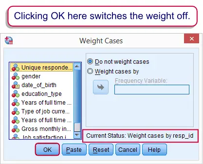 3. WEIGHT OFF.:关闭个案权重。执行此操作后,每个个案将再次被视为一个独立的个案。