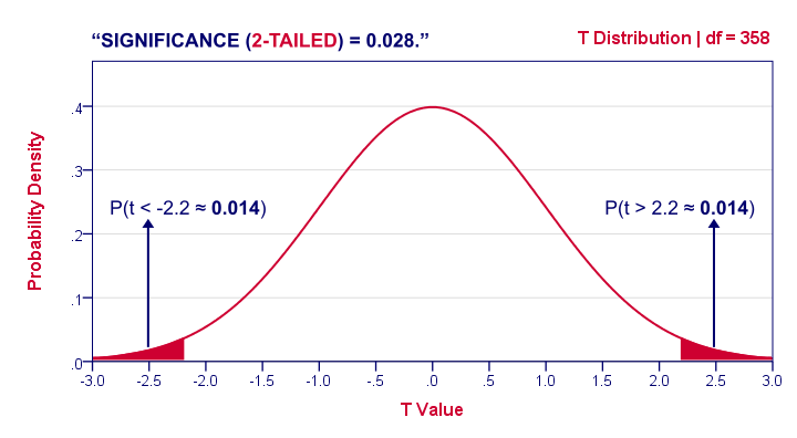 一个惯例是计算 t = -2.2 和相反效应的 p 值:t = 2.2。将它们相加得到我们的双尾 p 值:在我们的示例中,p (双尾) = 0.028。因为分布围绕 0 对称,所以这两个 p 值相等。因此,我们不妨将单尾 p 值加倍。