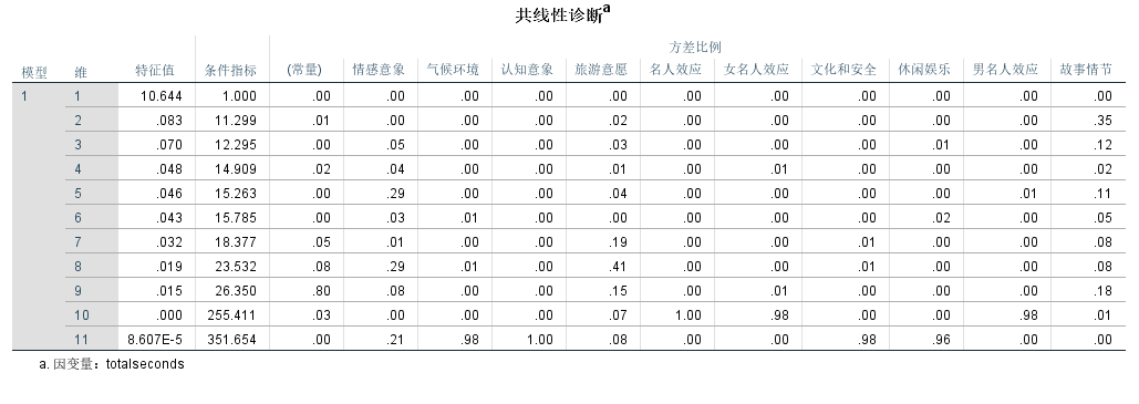 如果条件指标超过15, 我们就可以认为出现了共线性的问题, 如果该维度上有共线性的问题, 我们需要在该行找到方差比例超过0.9的变量, 比如第十维有三个变量的方差比例超过了0.9, 他们是:名人效应/女名人效应/男名人效应, 因此我们可以考虑删掉两个变量, 只保留一个变量