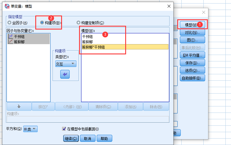 但是考虑到, “前抑郁"的不同水平可能会影响干预效果, 所以我们还得考虑"前抑郁"对结果的影响, 但是"协方差分析"的方法已经无法继续做, 那么我们可以讲"前抑郁"分为高低分组, 然后将其设置为"固定因子”, 进行两因素方差分析