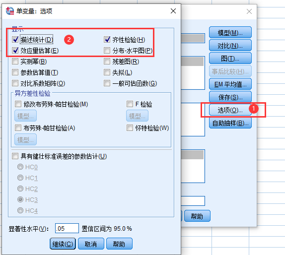 在"选项"对话框中, 我们需要勾选"描述统计"/“齐性检验"和"效应量估算”