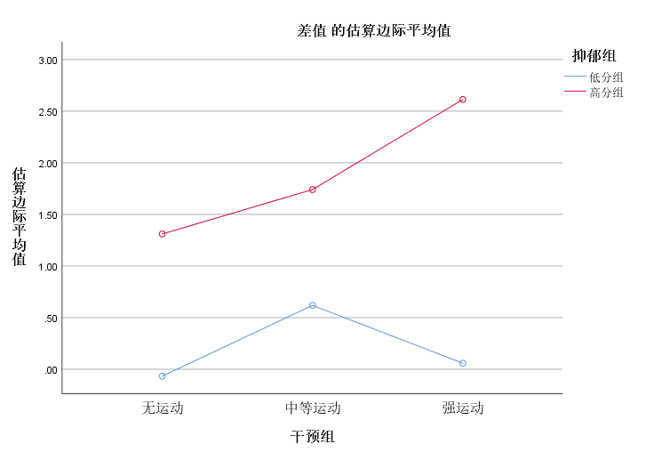 在成对比较中, 我们可以看到, 在抑郁低分组中, 干预组的不同水平并不影响差值(p>0.05), 而在高分组中, "强运动"与"无运动"和"中等运动"的相比, 干预前后的抑郁差值差别显著, "强运动组"对抑郁的影响更强, 更能降低抑郁倾向。